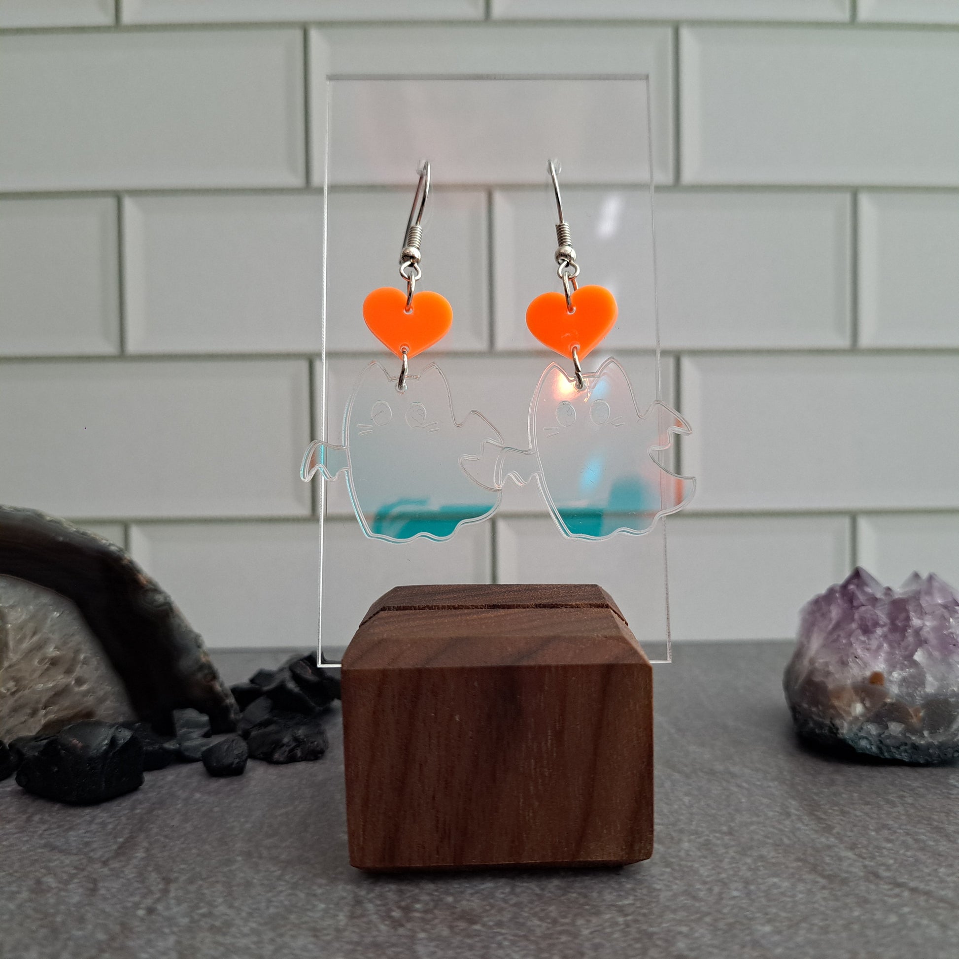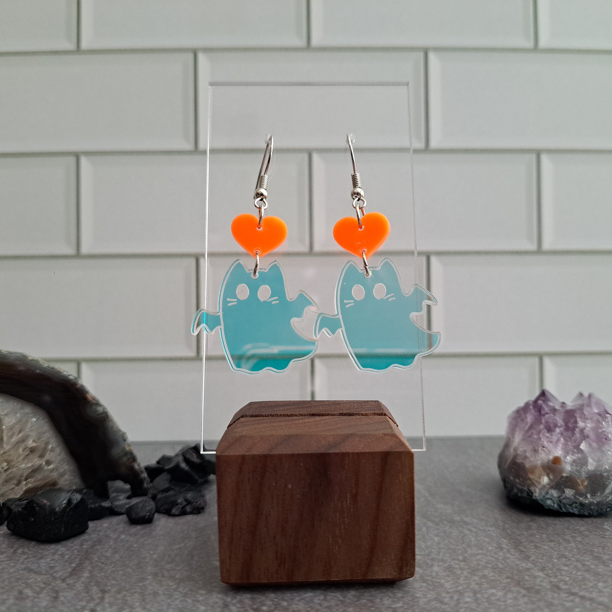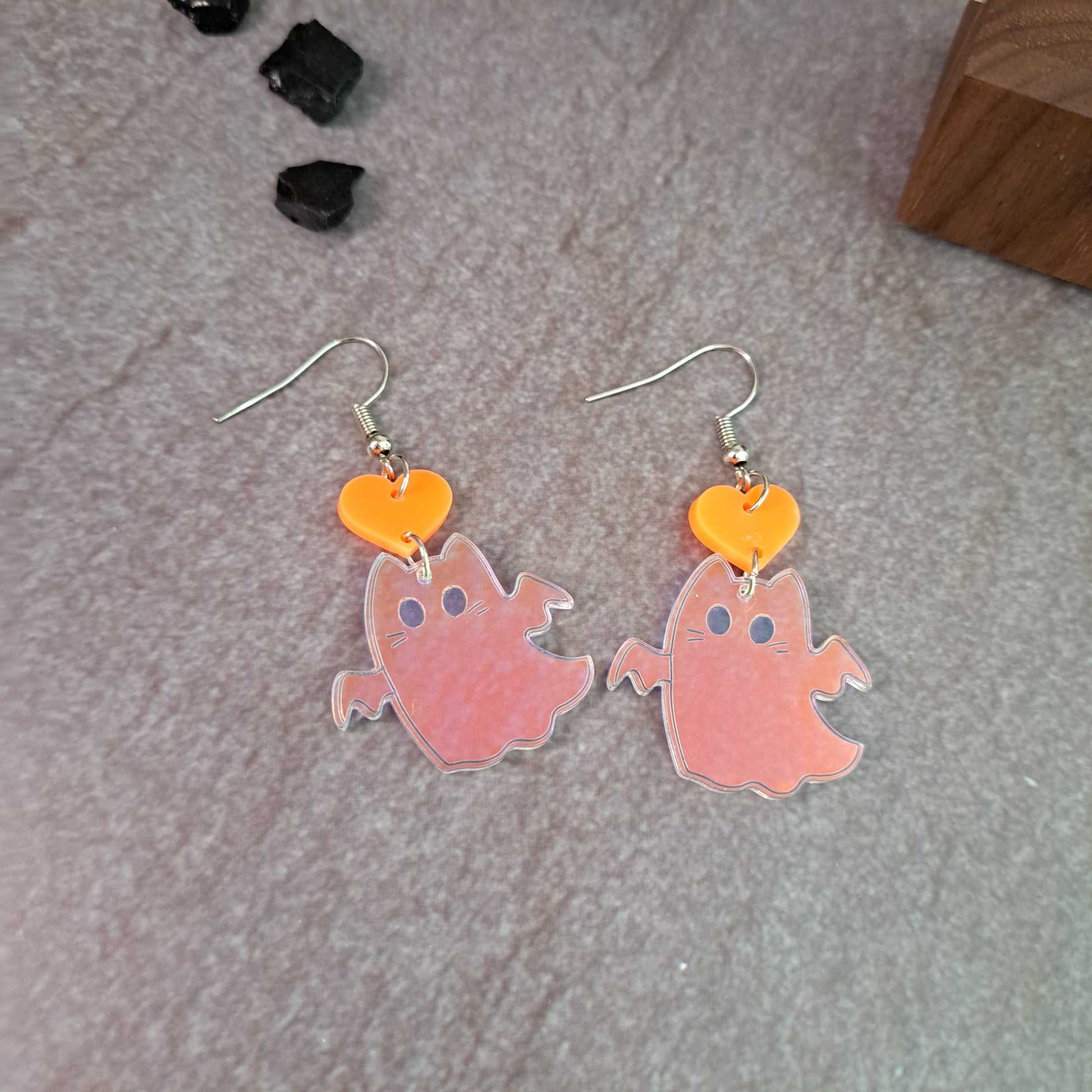 Kitty Ghosts with Orange Heart Dangle Earrings. They've come back to remind you to feed them!
